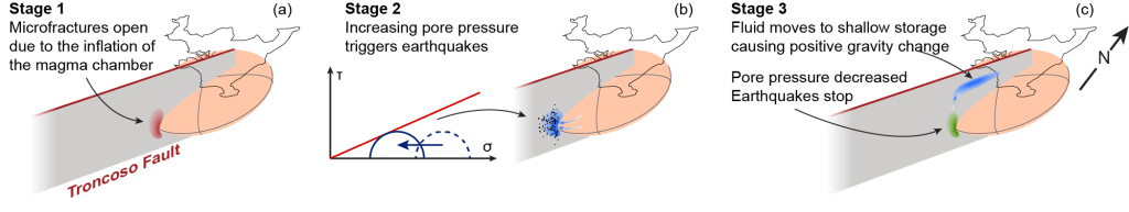 The Laguna del Maule (LdM) volcanic field is a large rhyolitic magmatic system in the Chilean Andes, which has exhibited frequent eruptions during the past 20 ka. Rapid surface uplift (>20 cm/yr) has been observed since 2007 accompanied by localized earthquake swarms and micro-gravity changes, indicating the inflating magma reservoir may interact with a pre-existing weak zone (i.e., Troncoso fault). In this investigation, we model the magma reservoir by data assimilation with InSAR data. The reservoir geometry is comparable to the magma body inferred by seismic tomography, magnetotelluric, and gravity studies. The models also suggest that a weak zone, which has little effect on surface displacement, can significantly affect the stress field and host rock failure development, especially with high pore-pressures (Fig. 1). In particular, concentrated dilatancy within the weak zone facilitates the microfracture formation during reservoir inflation. High-pressure fluid can inject into the weak zone from the magma reservoir to trigger earthquakes, and further migrate upwards to create positive gravity changes by occupying unsaturated storages. The pore pressure will then decrease, halting the seismicity swarm until the next cycle. This “hydrofracturing” process may release some accumulated stress along the magma reservoir delaying an eventual eruption in turn. Besides, the resultant models are propagated forward in time to evaluate potential stress trajectories for future unrest.
