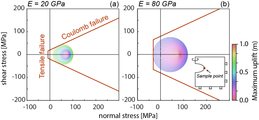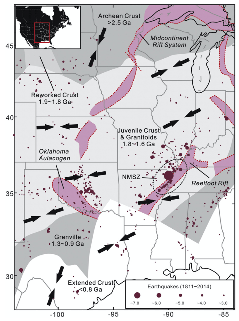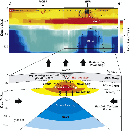 The mechanism of intraplate earthquakes is not well understood. For example, the New Madrid Seismic Zone (NMSZ) in the Midwestern United States was the site of several major M 6.8–8 earthquakes in 1811–1812 and remains seismically active, but the ultimate controls on earthquake initiation and the duration of the seismicity remain unclear. In Zhan et al. (2016), we develop a series of numerical experiments to determine the impact of lithospheric heterogeneity on earthquake nucleation and rupture processes (Fig. 2). The rheological structure of the lithosphere is inferred by seismic tomography. Results indicate that due to a relatively weak upper mantle, the differential stress prefer to accumulate beneath the crust of NMSZ, whereas the stresses below the geologically similar Midcontinent Rift System are comparatively low. The numerical observations coincide with the observed distribution of seismicity throughout the region. Furthermore, the relatively strong crust in this region, exhibited by high seismic velocities, enables the elevated stress to extend to the base of the ancient rift system, reactivating fossil rifting faults and therefore triggering earthquakes.
