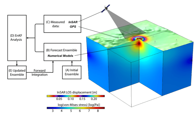 In Zhan et al. (2017), the EnKF is used to provide a “hindcast” of the 2009 explosive eruption of Kerinci volcano, Indonesia. A two-source analytical model is used to simulate the surface deformation of Kerinci volcano observed by InSAR time-series data and to predict system evolution. A deep, deflating dike-like source reproduces the subsiding signal on the flanks of the volcano, and a shallow spherical McTigue source reproduces the central uplift. EnKF predicted parameters are used in finite element models to calculate the host-rock stress state prior to the 2009 eruption. Models reveal that the host rock around the shallow magma reservoir was trending towards tensile failure prior to 2009, which may have been the catalyst for the 2009 eruption. Another application of the EnKF approach is utilizing high performance computing data assimilation to provide a successful forecast of the 26 June 2018 eruption of Sierra Negra volcano in the Galápagos, more than six months in advance (Gregg and Zhan et al., in prep.). Forecast models combined with satellite InSAR data reveal that the evolution of the stress state in the host rock surrounding the Sierra Negra magma system likely controlled the timing of the eruption.